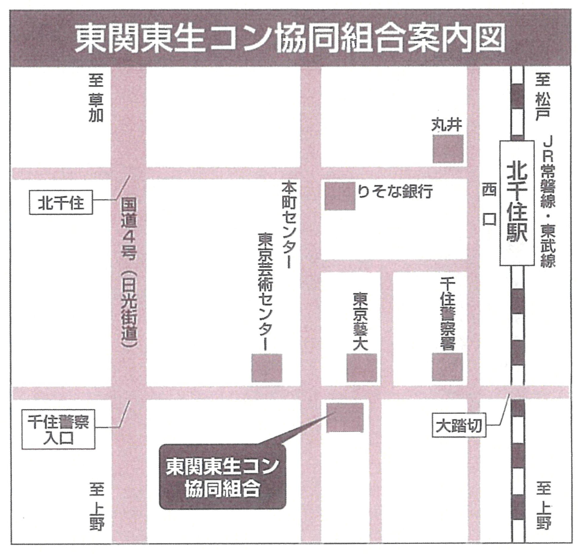 常磐線・千代田線・つくばエクスプレス線 北千住駅 仲町出口(駅を背にして)を出て左折、線路沿いを歩き千住警察署の交差点(左側踏切)を右折、東京芸大北千住キャンパスの前のスギモト千住ビルが組合事務所(受付6F)です。 ※西口側ですが、仲町出口から出るのが最適ルートになります。